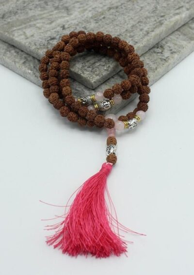 This is a Rudraksha seeds prayer mala from Nepal. The mala contains 108 Rudraksha beads with white metal Buddha head spacer. The guru bead contains Buddha head with Rose quatrz and pink tassel.