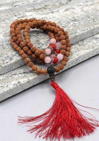 This is a Rudraksha seeds prayer mala from Nepal. The mala contains 108 Rudraksha beads with coral and rose quartz spacer.