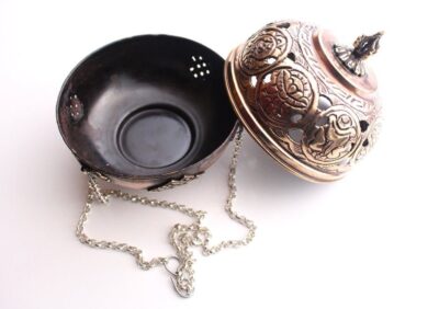 This is a very unique copper incense burner handmade in Nepal. This incense burner is carved beautifully with eight auspicious symbol. The incense burner has white metal chain attached to the hook in both side of the incense burner.