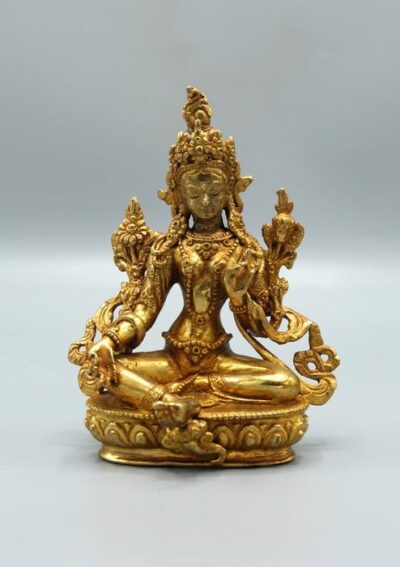 This is a gold plated Green Tara Statue which is completely hand crafted in Nepal. Nepalese sculptures are popular around the world since they are made with genuine ancient techniques and with the expertise of skilled craftspeople. Our sculptor is a fourth generation artist whose family has been sculpting for over a century now.