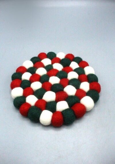 This is a Felt Balls Three Colors Round Trivet. This trivet is perfect addition to your kitchen ware during holidays as its bright vibrant colors are a delight. These trivets are thick enough to prevent heat damage to your tables and counter tops from hot kitchen dishes. It is handmade and durable with 100% pure wool.