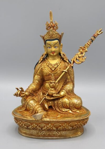 Here is a handcrafted Guru Padmasambhava also known as Guru Rinpoche statue. This high quality and gold plated statue of the Guru is made by a fourth generation sculptor in Nepal. Highly decorated with meticulous carving and smooth surface makes this statue unique.