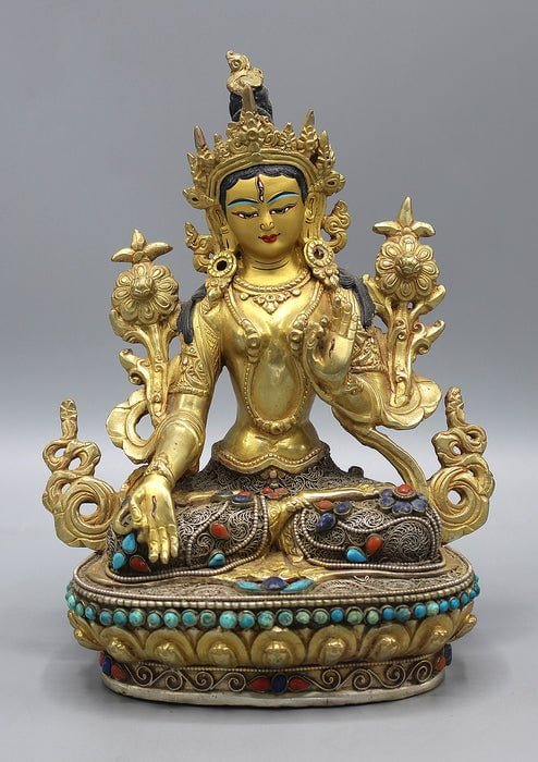 The lower body of White Tara is beautifully decorated with silver filigree and inlaid with faux Turquoise, Lapis and coral.