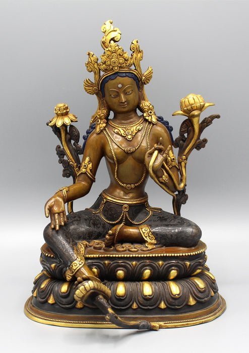 Green Tara is in the position of elegant repose in royal ease: her right foot resting on an extended lotus. Her left hand in the jhana mudra, the gesture of teaching, compliments her right hand which is elegantly arched in the varada mudra the gesture of giving. Two lotuses rise from each of her hands. Her body is youthful and sumptuous, representative of that delightful aspect of Tara which is wisdom, compassion and strength expressed in the form of an eternally young 16 year-old girl. This is an exceptional piece which beautifully expresses the eternal beauty and resonant power of the embodied Goddess.