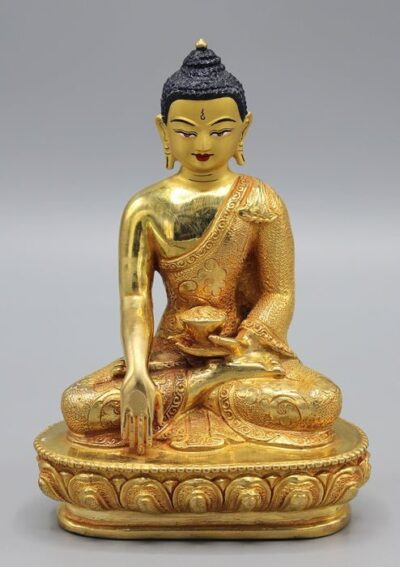 This is a fully gold plated Shakyamuni Buddha Statue. This Shakyamuni Buddha Statue is made by our artist who is a forth generation artist who learnt statue making from his grandfather. He continues to work and create beautiful masterpieces with us. His work has been adored by many. The statue has the perfect finishing with each details of Shakyamuni Buddha in a best way. The back side of the Buddha has fine floral carving. The face of Shakyamuni Buddha is glowing.