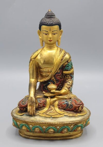 This is a 9″ inch high gold plated copper statue of Shakyamuni Buddha. The robe of Shakyamuni has painted with red and green color and dragon carving all over the body.