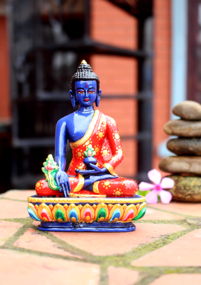 This is an exclusive handmade hand painted Resin Medicine Buddha statue. A dye is created by our master sculptor who specializes in creating various forms of Buddha. The resin Medicine Buddha is seated on a lotus as platform, holds a vase in his left hand and meditating calmly. The painting is then done by our Artist Meenu Shakya who has expressive skills and the painting is done completely by hands. The red and golden robe of the blue Medicine Buddha statue is glowing.