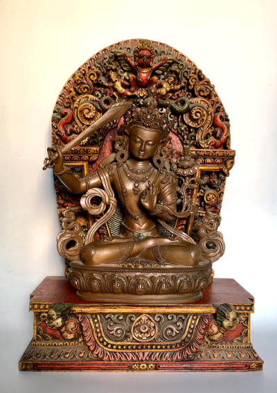 Here Manjushri is depicted as a male Bodhisattva wielding a flaming sword in his right hand, representing the realization of transcendent wisdom which cuts down ignorance and duality. The scripture supported by the Padma (lotus) held in his left hand is a Prajnaparamita sutra, representing his attainment of ultimate realization from the blossoming of wisdom. Manjushree is here seated on a single padma(Lotus) on a wooden throne.