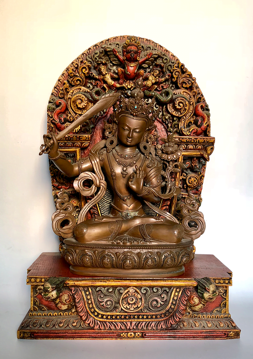 This is a High quality 16.5 Inches High Copper Statue of Manjushree, seated on intricately carved wooden throne. The statue is handmade in a traditional way. The artist who made this statue is now a forth generation statue maker and is extremely talented which can be seen in the fine, intricate and smooth details of the statue. The statue has a perfect details with perfect expressions.