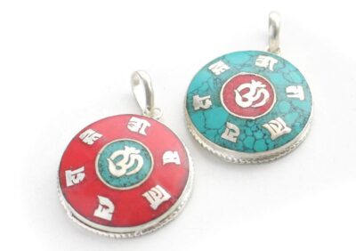 This is a beautiful faux Coral and Turquoise inlaid round white metal pendant with silver plating. This pendant has high ritual sentiment and popular in the Buddhist culture. The pendant has Hindu Om in the center along with Tibetan mantra.