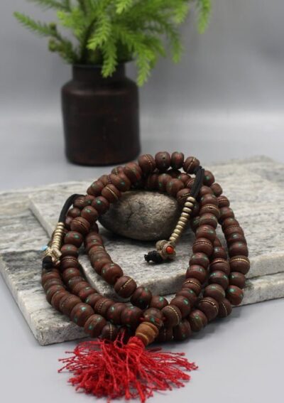 This tibetan prayer mala is made of 108 bodhi seeds along with guru bead strung together with a strong thread. The mala has beautiful tassel. It has two white metal spacer. This mala is beautifully inlaid with Copper faux turquoise and faux coral pieces.