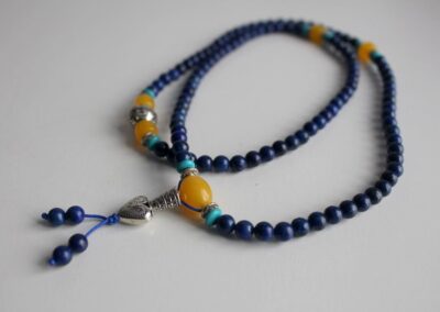 This is a beautiful Faux Lapis Lazuli Prayer Beads adjustable Mala consisting of 108 beads along with 3 amber spacers and a heart charm. The beads are 6mm in size.