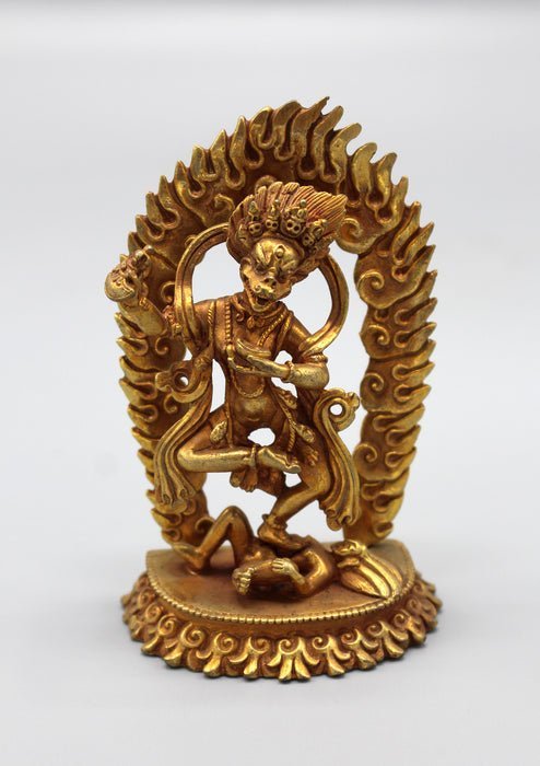 This is a beautiful Dakini statue handcrafted in Nepal by Nepalese Artist. This statue is fully gold plated statue which is only 4″ high. The Artist has given a full effort in making this statue perfect with each details like lion faced, Necklace worn by statue with wonderful finishing. The Dakini is a female being of generally volatile temperament, who acts as a muse for spiritual practice. In sanskrit, Dakini is a female messenger of wisdom.