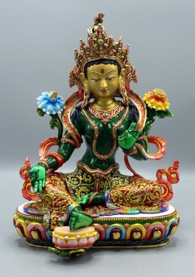 This is a beautiful Masterpiece Face Painted Copper statue of Green Tara, also known as Tibetan Dolma. This statue is a hand painted by our artist Meenu Shakya. The robe of the statue is hand painted with unique embossed painting style.