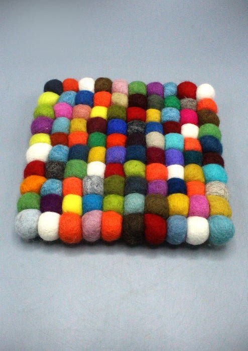 This is a Multi Color Felt Ball Square Trivet. This trivet is perfect addition to your kitchen ware during holidays as its bright vibrant colors are a delight. These trivets are thick enough to prevent heat damage to your tables and counter tops from hot kitchen dishes. It is handmade and durable with 100% pure wool.
