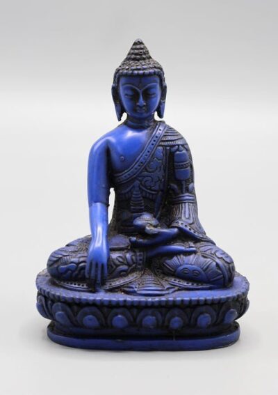 This is a handmade Resin Shakyamuni Buddha. A dye is created by our master sculptor who specializes in creating various forms of Buddha. His work is very intricate and has been adored by many. The resin Shakyamuni Buddha is seated on a lotus as platform, holds a vase in his left hand and meditating calmly while is hand touches the ground in the Bhumisparsa pose.