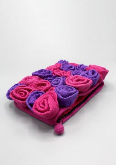 This is a beautifully hand felted Felt Clutch Purse which has multicolor flower sewn into a pink purse and this is handmade in Nepal. This purse is decorated with beautiful rose. The purse is very soft and very durable. It has a zipper closure to provide safety to your belongings. There is a small pink ball attached to its zipper.