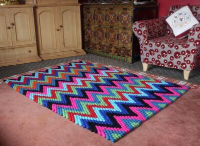 This is a wonderfully colorful zig zag patterned rectangular felt rug. Our women artists first felted the woolen balls and then stiched each one of the balls to make this beautiful rug. This rug is made from five different colored felt balls. The zig zag pattern gives a cool look to the rug.