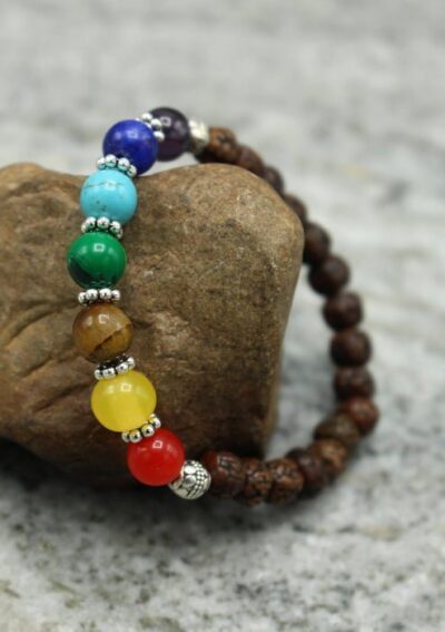 The Rudraksha beads are strung in a durable and slightly stretchable nylon band with Seven Chakra stone beads.The metal beads are known as ‘german silver’ which do not turn black and retain their shine.