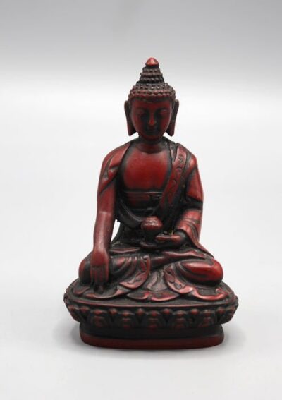 This is a handmade Resin Shakyamuni Buddha. A dye is created by our master sculptor who specializes in creating various forms of Buddha. His work is very intricate and has been adored by many. The resin Shakyamuni Buddha is seated on a lotus as platform, holds a vase in his left hand and meditating calmly while is hand touches the ground in the Bhumisparsa pose. The simplicity of this statue shows the nature of Buddha and the world. Having this statue near you or around you brings the sense of being peaceful, calm and right.
